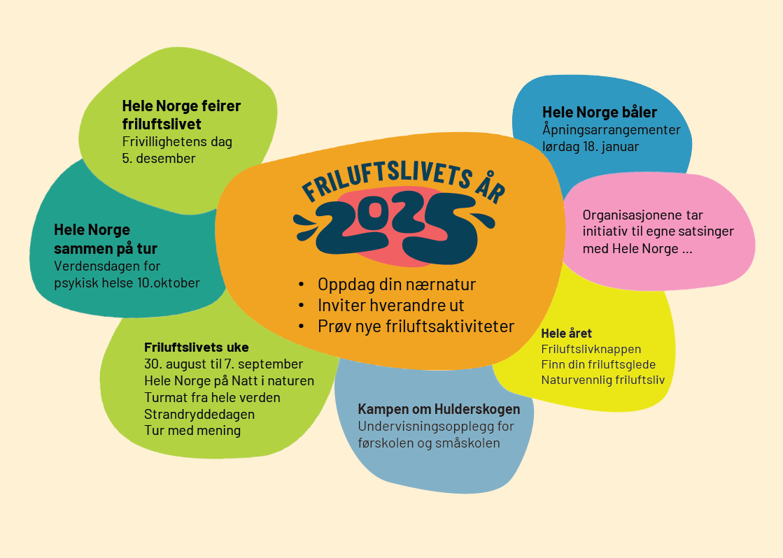 Vi vil oppfordre alle lag- og foreninger til å planlegge og synliggjøre sine aktiviteter i løpet av friluftsåret og kanskje med mål om å rekruttere nye medlemmer. Det kan være alt fra fysiske arrangementer til foredrag om laget eller foreningens aktiviteter. Vi kan bidra med å markedsføre arrangementet og du vil også kunne bruke logoen for friluftsåret. Trenger du et lokale for et foredrag eller en aktivitet, kan vi også være behjelpelig med det. Aktiviteter som inngår i friluftslivets år, kan synliggjøres på Friluftslivet 2025 aktivitetskalender.